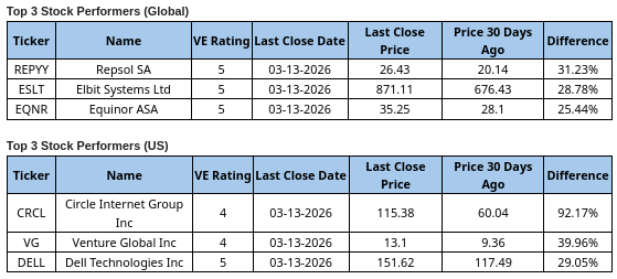 U.S. equity markets experienced broad-based weakness this week as investors remained cautious amid ongoing macroeconomic uncertainty and continued sector rotation. Most major equity benchmarks declined, with technology, industrial, and consumer discretionary sectors leading the pullback. Despite the broader market softness, the energy sector showed relative strength, supported by firm commodity prices and continued geopolitical tensions. At the same time, several individual stocks—particularly in energy, defense, and select technology names—continued to post strong gains over the past month, suggesting that investors are still selectively positioning in industries expected to benefit from the current global economic and geopolitical environment.