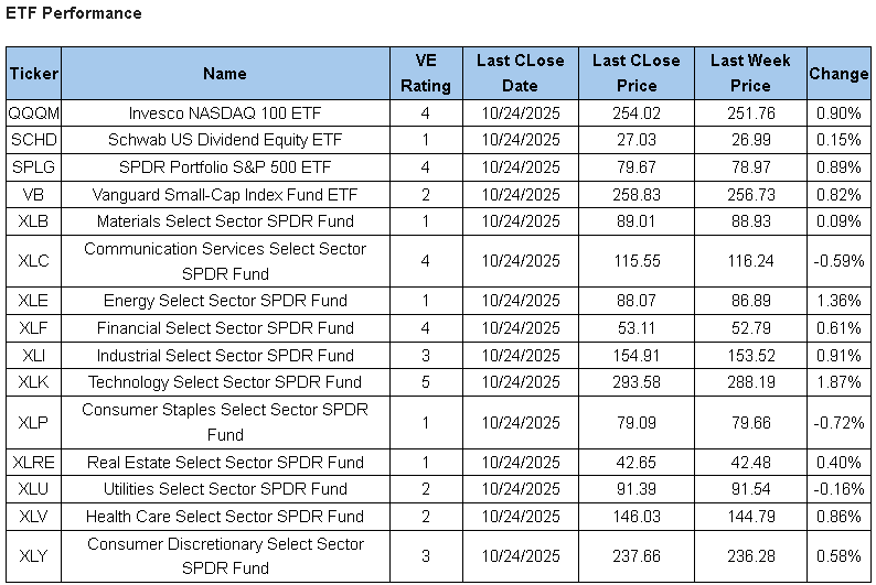 The great rotation to value stocks predicted by many market pundits hasn’t worked out in all but one month this year—and certainly not in October. VUG (Vanguard Growth Index Fund ETF) gained 2.8% versus 0.8% for VTV (Vanguard Value Index Fund ETF). One rotation that has been working better since midyear is the recovery in small-cap stocks. Our barometer IWM (iShares Russell 2000 ETF) has gained 3.4% so far in October, double the 1.7% gain of SPLG (SPDR Portfolio S&P 500 ETF). Surprisingly, the top gainer among the index ETFs we follow this month has been VPU (Vanguard Utilities Index Fund ETF) with a spectacular 5.2% rise.