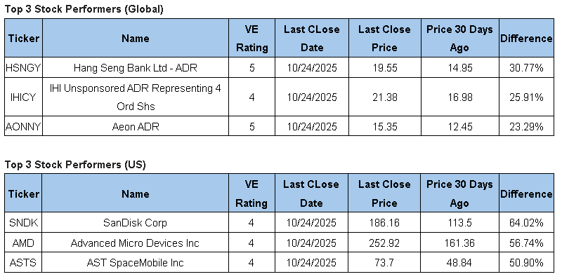 Tech led the week, with XLK +1.87% and QQQM +0.90%, while defensives lagged (XLP –0.72%, XLU -0.16%). Energy firmed (XLE +1.36%) and small-caps inched up (VB +0.82%). Over 30 days, AMD, SNDK, and ASTS headline U.S. gainers, while HSGNY tops ADRs.