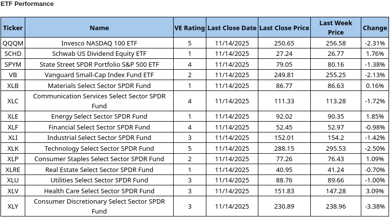 Thus far, turning the calendar to November has inverted the order of most market benchmark index ETFs we follow here. As abruptly as flipping a light switch, the market has shifted from a “risk-on” to “risk-off” environment. Small-cap stocks, represented by IWM (the iShares Russell 2000 Small Cap ETF), have plummeted more than 3.5% month-to-date, leading the decline. In contrast, the State Street® SPDR® Portfolio S&P 500® ETF (SPYM) regained only a tiny fraction of last week’s losses and remains down 1.5% for the month, while the Invesco Nasdaq-100 ETF QQQM is still down 3.2%.